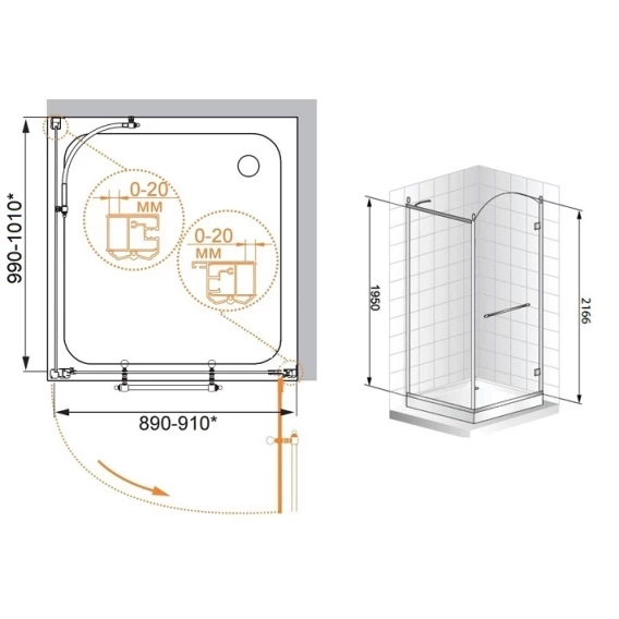 • Габариты с диапазоном регулировок, мм: (890-910)x(990-1010)x2166