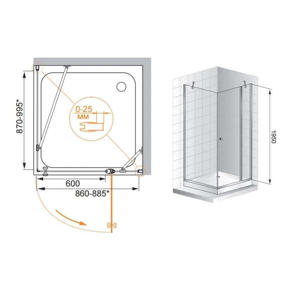 • Габариты с диапазоном регулировок, мм: (860-885)х(870-895)х1970
