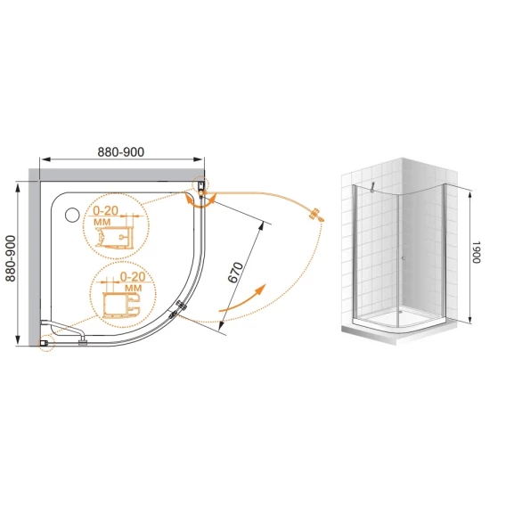 • Габариты с диапазоном регулировок, мм: (880-900)x(880-900)x1950