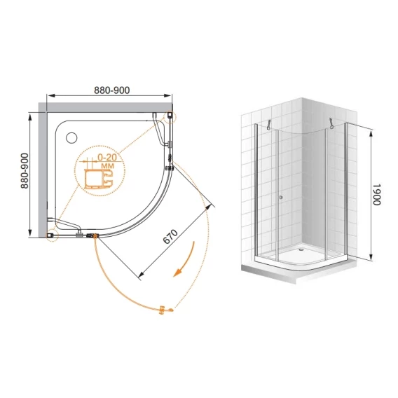 • Габариты с диапазоном регулировок, мм: (880-900)x(880-900)x1950