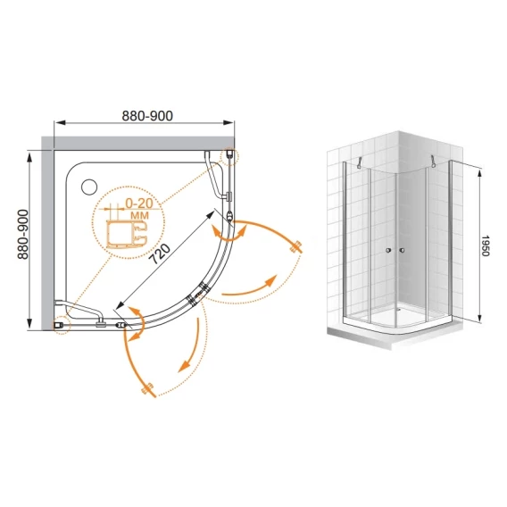 • Габариты с диапазоном регулировок, мм: (880-900)x(880-900)x1950