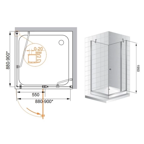 • Габариты с диапазоном регулировок, мм: (880-900)x(880-900)x1950