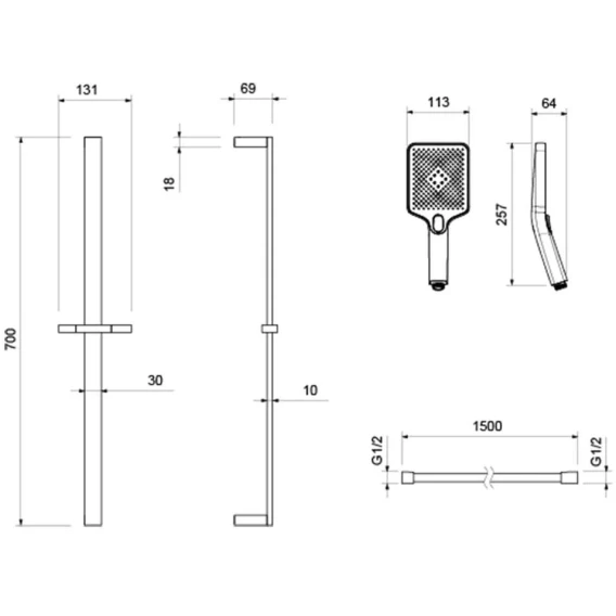Крепление, Душевой шланг, Душевая лейка, Держатель для душевой лейки, Штанга душевая