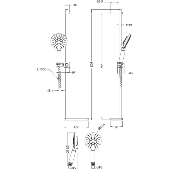 Крепление, Душевой шланг, Душевая лейка, Держатель для душевой лейки, Полочка, Штанга душевая