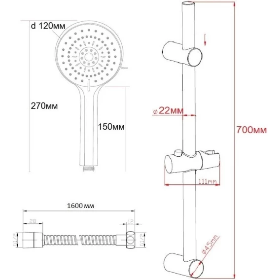 Крепление, Душевой шланг, Душевая лейка, Держатель для душевой лейки, Крючок, Штанга душевая