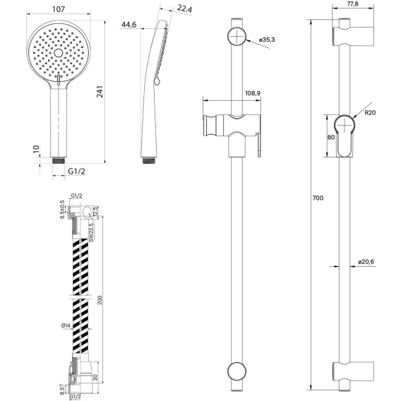 Крепление, Душевой шланг, Душевая лейка, Держатель для душевой лейки, Штанга душевая
