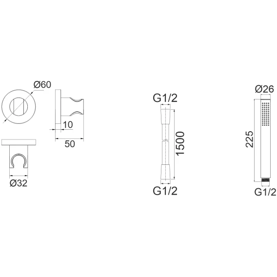 Крепление, Душевой шланг, Душевая лейка, Держатель для душевой лейки