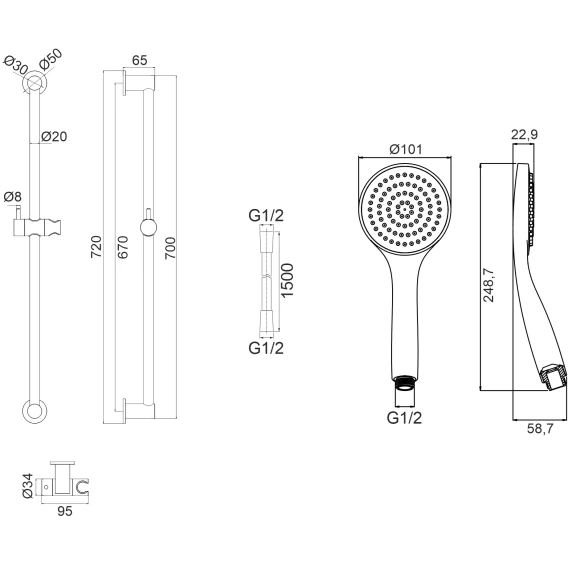 Крепление, Душевой шланг, Душевая лейка, Держатель для душевой лейки, Штанга душевая