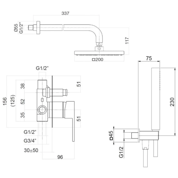 Душевой шланг, Душевая лейка, Подключение для душевого шланга с держателем, Верхний душ, Скрытая монтажная часть, Смеситель, Кронштейн