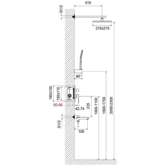 Аэратор, Душевой шланг, Душевая лейка, Держатель для душевой лейки, Подключение для душевого шланга, Верхний душ, Излив, Скрытая монтажная часть, Смеситель, Кронштейн