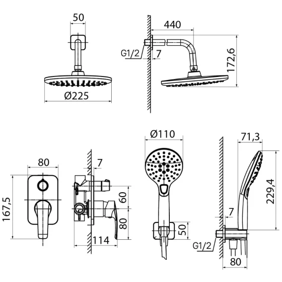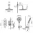 Душевой шланг, Душевая лейка, Подключение для душевого шланга с держателем, Верхний душ, Скрытая монтажная часть, Смеситель, Кронштейн