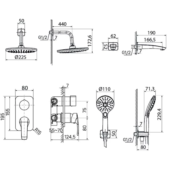 Аэратор, Душевой шланг, Душевая лейка, Подключение для душевого шланга с держателем, Верхний душ, Излив, Скрытая монтажная часть, Смеситель, Кронштейн