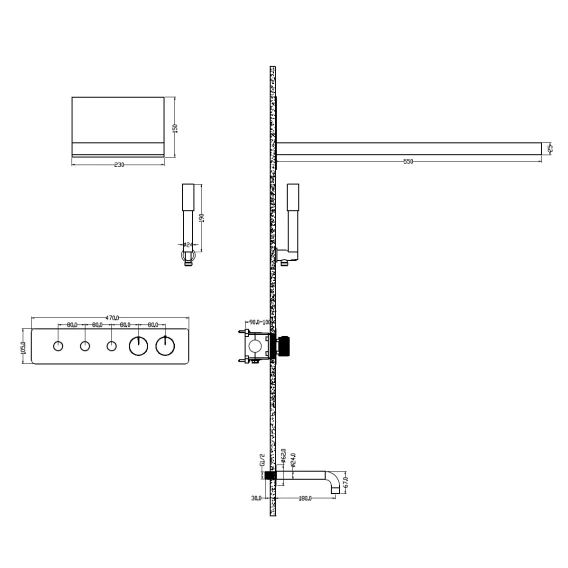 Аэратор, Душевой шланг, Душевая лейка, Подключение для душевого шланга с держателем, Верхний душ, Излив, Скрытая монтажная часть, Кронштейн, Термостат