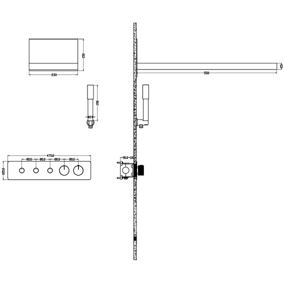 Душевой шланг, Душевая лейка, Подключение для душевого шланга с держателем, Верхний душ, Скрытая монтажная часть, Кронштейн, Термостат