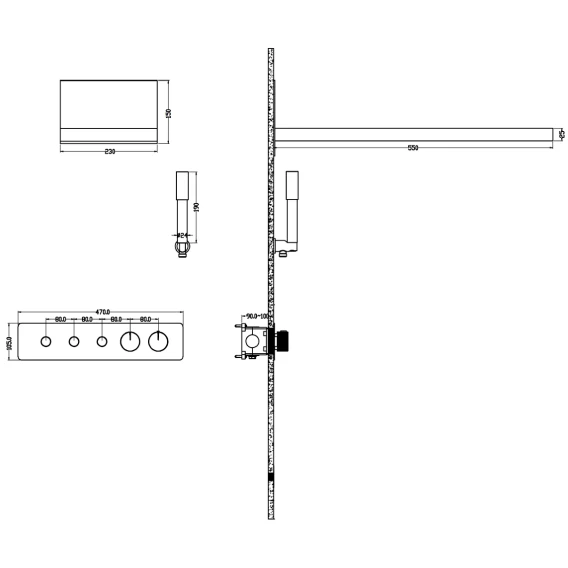 Душевой шланг, Душевая лейка, Подключение для душевого шланга с держателем, Верхний душ, Скрытая монтажная часть, Кронштейн, Термостат