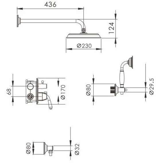 Душевой шланг, Душевая лейка, Держатель для душевой лейки, Подключение для душевого шланга, Верхний душ, Скрытая монтажная часть, Смеситель, Кронштейн