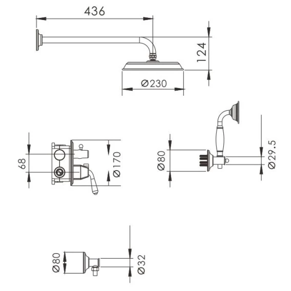 Душевой шланг, Душевая лейка, Держатель для душевой лейки, Подключение для душевого шланга, Верхний душ, Скрытая монтажная часть, Смеситель, Кронштейн