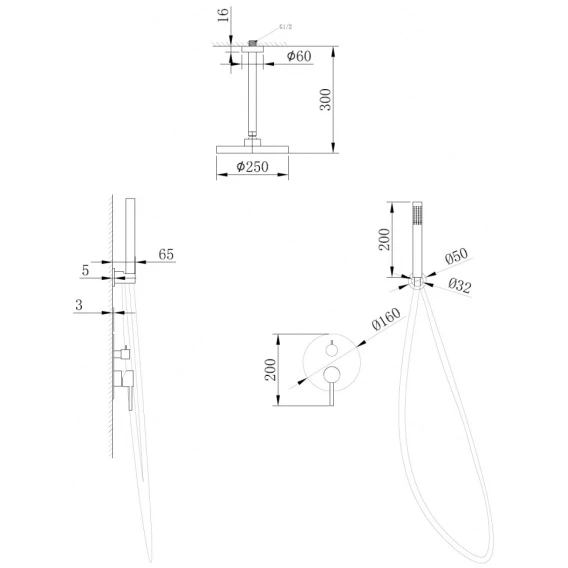 Душевой шланг, Душевая лейка, Подключение для душевого шланга с держателем, Верхний душ, Скрытая монтажная часть, Смеситель, Кронштейн