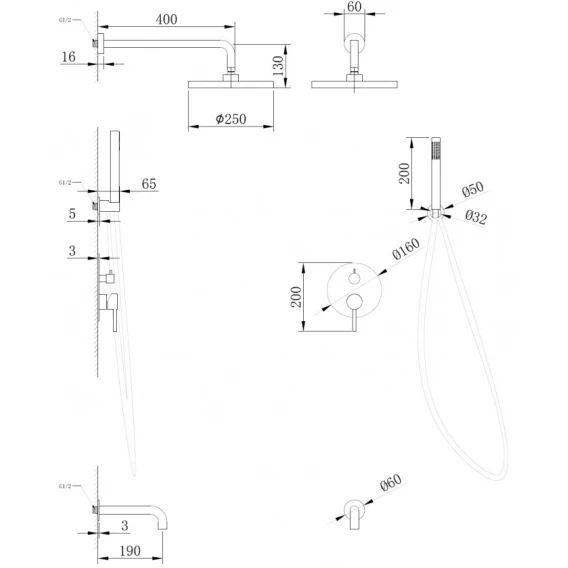 Аэратор, Душевой шланг, Душевая лейка, Подключение для душевого шланга с держателем, Верхний душ, Излив, Скрытая монтажная часть, Смеситель, Кронштейн