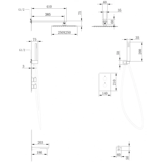 Аэратор, Душевой шланг, Душевая лейка, Подключение для душевого шланга с держателем, Верхний душ, Излив, Скрытая монтажная часть, Кронштейн, Термостат