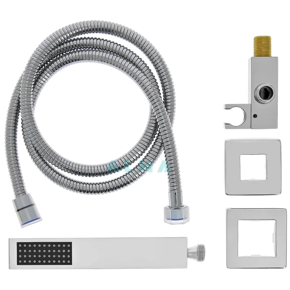 Аэратор, Душевой шланг, Душевая лейка, Подключение для душевого шланга с держателем, Верхний душ, Излив, Скрытая монтажная часть, Смеситель, Кронштейн