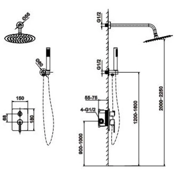 Душевой шланг, Душевая лейка, Подключение для душевого шланга с держателем, Верхний душ, Скрытая монтажная часть, Смеситель, Кронштейн