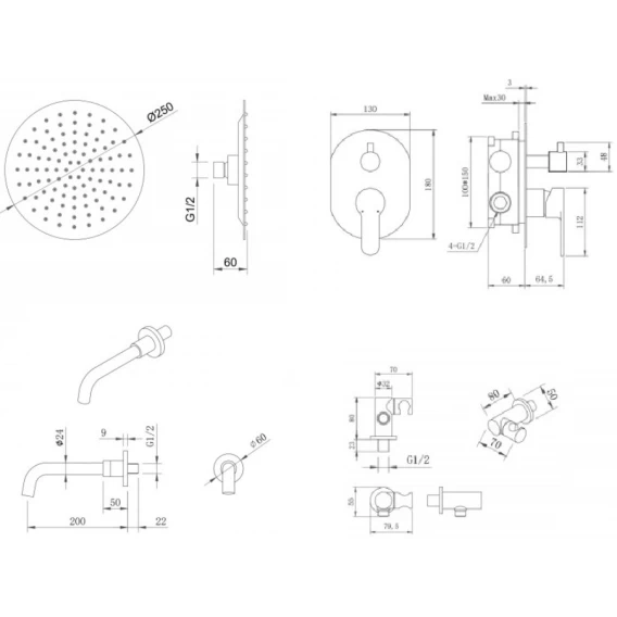 Аэратор, Душевой шланг, Душевая лейка, Подключение для душевого шланга с держателем, Верхний душ, Излив, Скрытая монтажная часть, Смеситель, Кронштейн