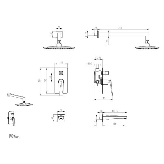 Аэратор, Душевой шланг, Душевая лейка, Подключение для душевого шланга с держателем, Верхний душ, Излив, Скрытая монтажная часть, Смеситель, Кронштейн