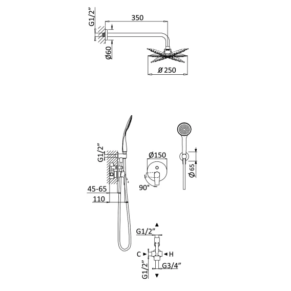 Душевой шланг, Душевая лейка, Подключение для душевого шланга с держателем, Верхний душ, Скрытая монтажная часть, Смеситель, Кронштейн