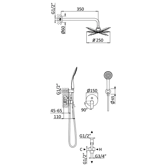 Душевой шланг, Душевая лейка, Подключение для душевого шланга с держателем, Верхний душ, Скрытая монтажная часть, Смеситель, Кронштейн