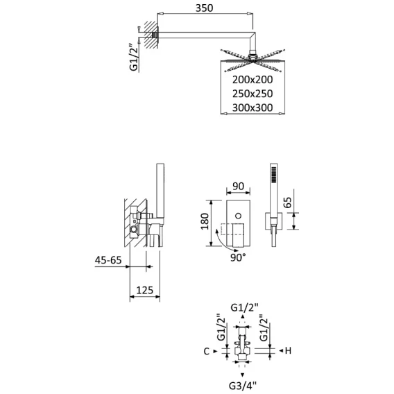 Душевой шланг, Душевая лейка, Подключение для душевого шланга с держателем, Верхний душ, Скрытая монтажная часть, Смеситель, Кронштейн