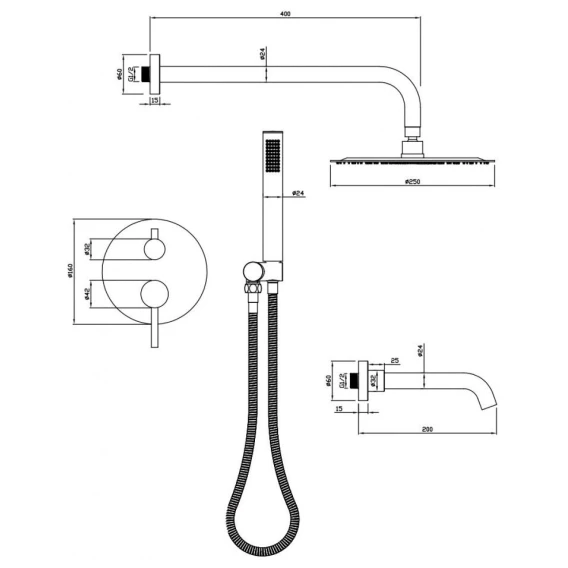 Аэратор, Душевой шланг, Душевая лейка, Подключение для душевого шланга с держателем, Верхний душ, Излив, Скрытая монтажная часть, Смеситель, Кронштейн