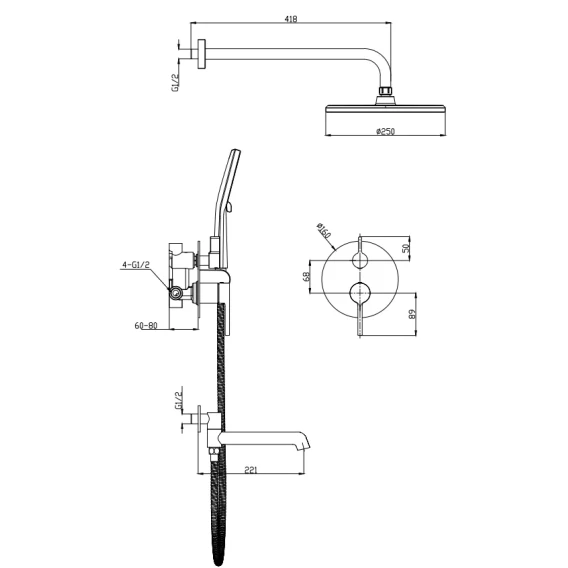 Аэратор, Душевой шланг, Душевая лейка, Держатель для душевой лейки, Верхний душ, Излив, Скрытая монтажная часть, Смеситель, Кронштейн