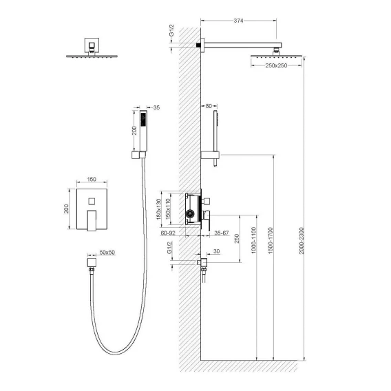 Душевой шланг, Душевая лейка, Держатель для душевой лейки, Подключение для душевого шланга, Верхний душ, Скрытая монтажная часть, Смеситель, Кронштейн
