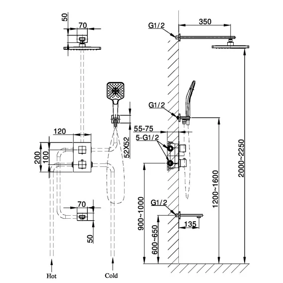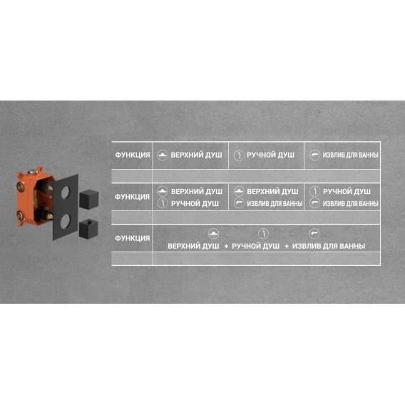 Аэратор, Душевой шланг, Душевая лейка, Подключение для душевого шланга с держателем, Верхний душ, Излив, Скрытая монтажная часть, Кронштейн, Термостат