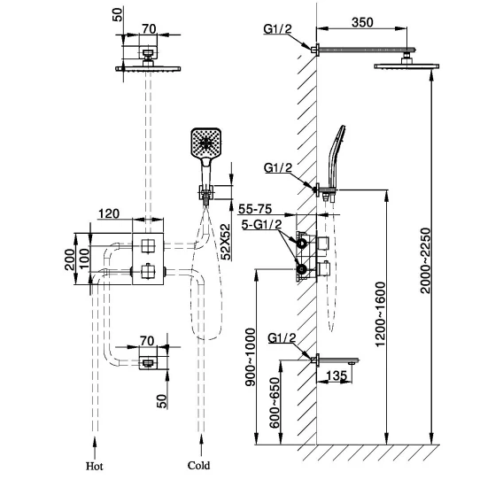 Аэратор, Душевой шланг, Душевая лейка, Подключение для душевого шланга с держателем, Верхний душ, Излив, Скрытая монтажная часть, Кронштейн, Термостат