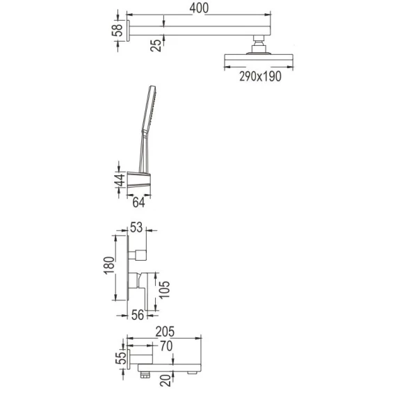 Аэратор, Душевой шланг, Душевая лейка, Держатель для душевой лейки, Подключение для душевого шланга, Верхний душ, Излив, Скрытая монтажная часть, Смеситель, Кронштейн