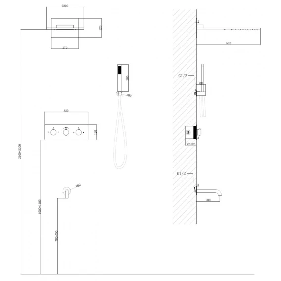 Аэратор, Душевой шланг, Душевая лейка, Подключение для душевого шланга с держателем, Верхний душ, Излив, Скрытая монтажная часть, Кронштейн, Термостат
