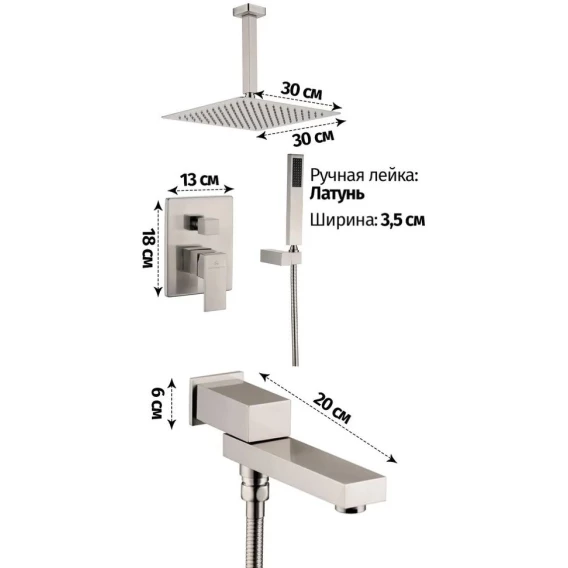 Аэратор, Душевой шланг, Душевая лейка, Держатель для душевой лейки, Подключение для душевого шланга, Верхний душ, Излив, Скрытая монтажная часть, Смеситель, Кронштейн