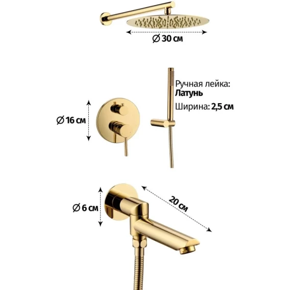 Аэратор, Душевой шланг, Душевая лейка, Держатель для душевой лейки, Подключение для душевого шланга, Верхний душ, Излив, Скрытая монтажная часть, Смеситель, Кронштейн