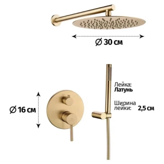 Душевой шланг, Душевая лейка, Подключение для душевого шланга с держателем, Верхний душ, Скрытая монтажная часть, Смеситель, Кронштейн
