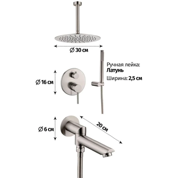 Аэратор, Душевой шланг, Душевая лейка, Держатель для душевой лейки, Подключение для душевого шланга, Верхний душ, Излив, Скрытая монтажная часть, Смеситель, Кронштейн
