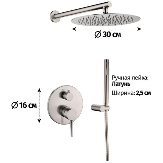 Душевой шланг, Душевая лейка, Подключение для душевого шланга с держателем, Верхний душ, Скрытая монтажная часть, Смеситель, Кронштейн