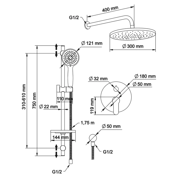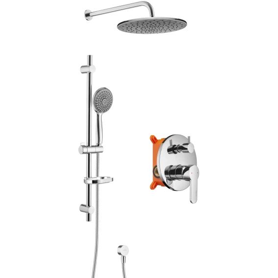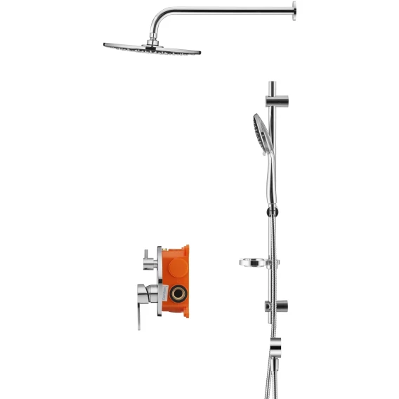 Душевой шланг, Душевая лейка, Держатель для душевой лейки, Подключение для душевого шланга, Верхний душ, Скрытая монтажная часть, Смеситель, Кронштейн, Мыльница, Штанга душевая