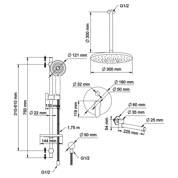 Аэратор, Душевой шланг, Душевая лейка, Держатель для душевой лейки, Подключение для душевого шланга, Верхний душ, Излив, Скрытая монтажная часть, Смеситель, Кронштейн, Мыльница, Штанга душевая