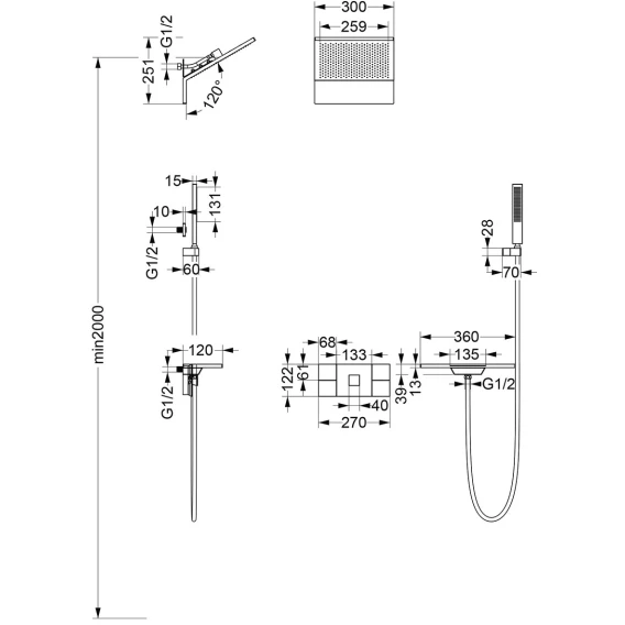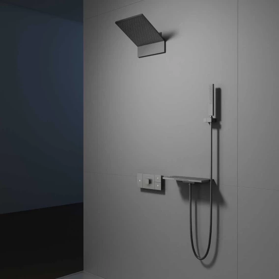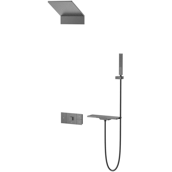 Душевой шланг, Душевая лейка, Держатель для душевой лейки, Полочка, Верхний душ, Излив, Скрытая монтажная часть, Кронштейн, Термостат