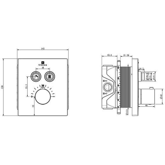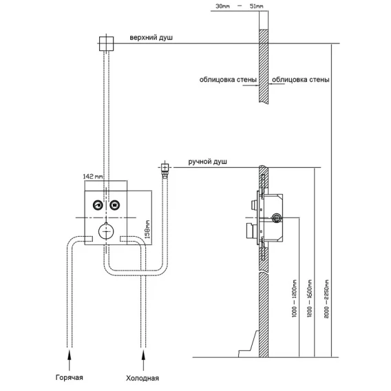 Душевой шланг, Душевая лейка, Подключение для душевого шланга с держателем, Верхний душ, Скрытая монтажная часть, Кронштейн, Термостат