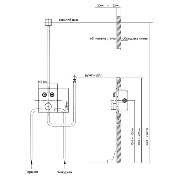 Душевой шланг, Душевая лейка, Подключение для душевого шланга с держателем, Полочка, Верхний душ, Скрытая монтажная часть, Кронштейн, Термостат