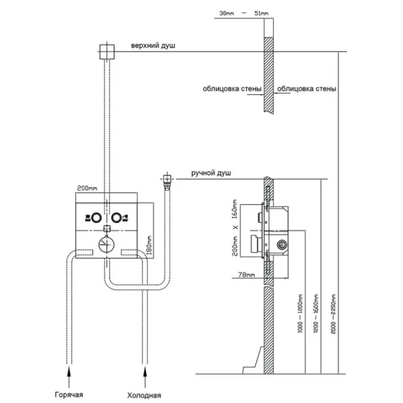 Душевой шланг, Душевая лейка, Подключение для душевого шланга с держателем, Верхний душ, Скрытая монтажная часть, Смеситель, Кронштейн