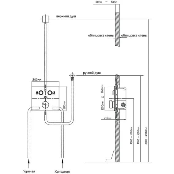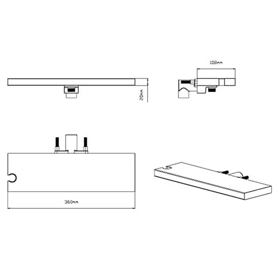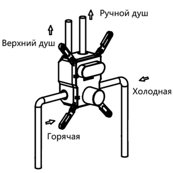 Душевой шланг, Душевая лейка, Подключение для душевого шланга с держателем, Полочка, Верхний душ, Скрытая монтажная часть, Смеситель, Кронштейн
